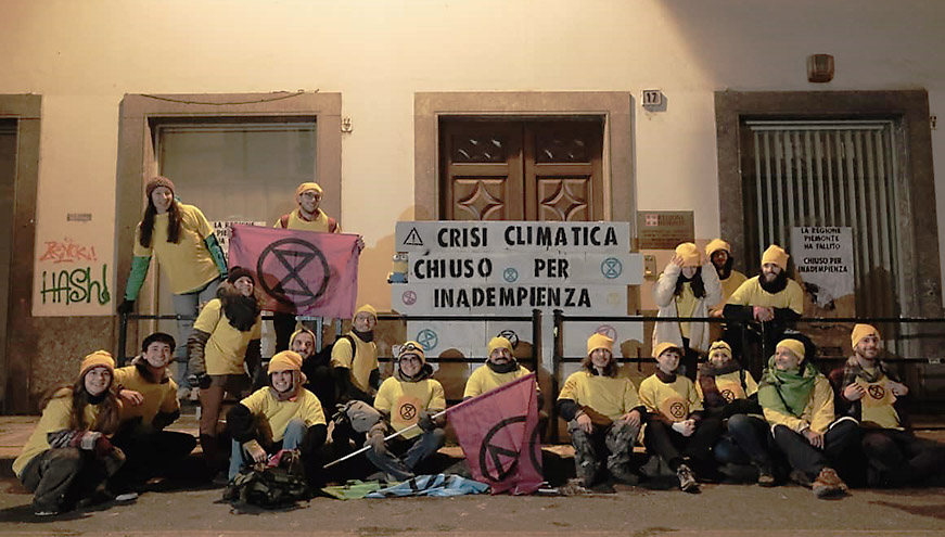 6 DEC | Torino, Italy: Rebels got to work constructing a two-metre high wall outside the entrance of the Regional Environment Department. "Climate Crisis. Closed Due to Default" was written on the bricks.