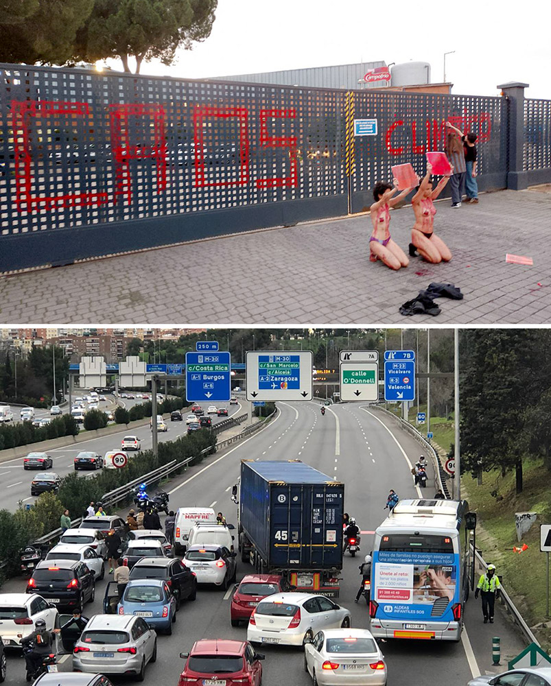 23 DEC | Madrid, Spain: Activists from Futuro Vegetal protest outside a major meat processing company and block a main road in Madrid. They called for the Spanish state to stop subsidising the meat industry and promote plant-based alternatives. Futuro Vegetal also sabotaged the largest slaughterhouse in Europe, which has the capacity to kill up to 30,000 animals each day.
