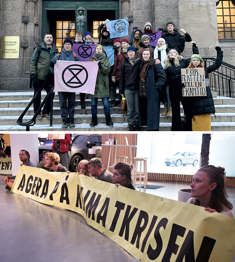 12 DEC | Stockholm, Sweden: 12 rebels were charged at the Stockholm District Court for a peaceful sit-in in a Volvo showroom where they demanded an end to fossil fuel subsidies. In a double irony, Volvo is both facing charges for climate crimes, and joining other Swedish corporations to launch a global climate appeal.