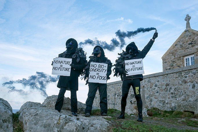 17 DEC | St Ives, UK: Three rebels dressed as crows broadcast the biodiversity message as COP15 closes. It is critical: in the past 60 years, 69% of all non-human life has gone from our planet. Photo: Gavan Goulder